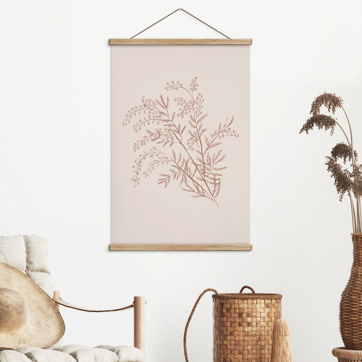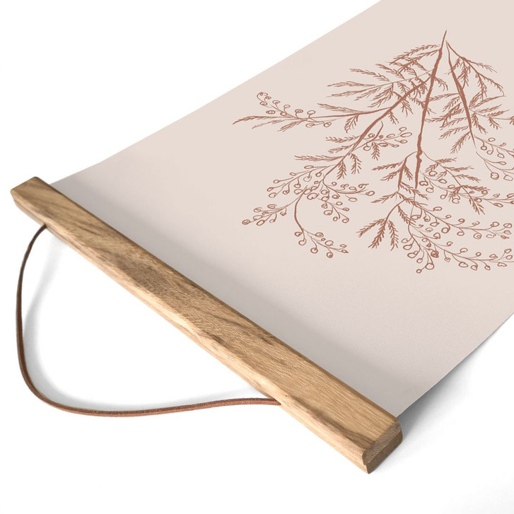 Mocha Mousse, eine der Pantone-Trendfarben für 2025, steht für Wärme, Natürlichkeit und subtile Eleganz. Der weiche, cremige Hintergrundton wirkt beruhigend, während die feinen botanischen Linien in warmem Braun die Schönheit der Natur mit einer minimalistischen Ästhetik verbinden. Die Kombination aus Stoff und Holz verleiht dem Bild einen modernen, skandinavischen Look.