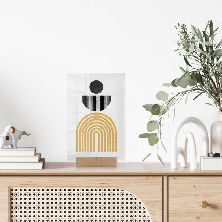 Erlebt moderne Kunst auf ganz neue Weise mit diesem stilvollen Tischdisplay, das eine elegante Kombination aus Acrylglas und Massivholz bietet. Das Design des Kunstwerks zeichnet sich durch seine abstrakte Komposition aus geometrischen Formen in Schwarz und Gold aus. Die schlichten, klaren Linien und das minimalistische Design verleihen diesem Kunstwerk eine besondere Ästhetik, die perfekt zu modernen und skandinavischen Einrichtungstrends passt.