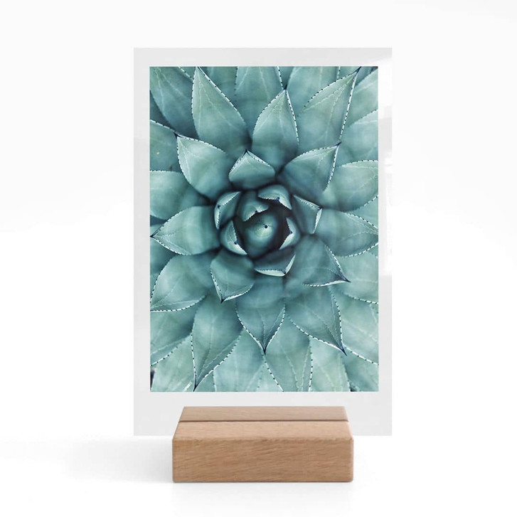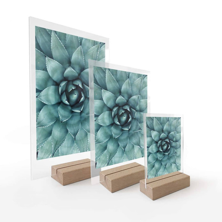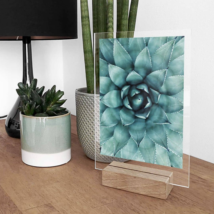 Edles Acrylglasbild zum Hinstellen aus klarem Acrylglas und massivem Holzfuss.