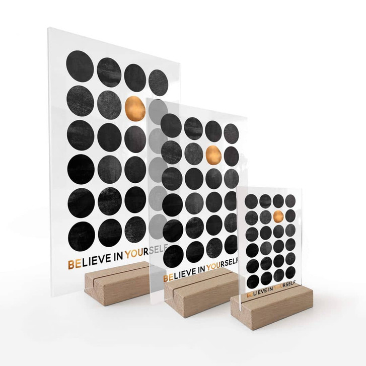Der Holzfuss ist für alle Grössen geeignet. Lediglich das Format vom Acrylglas verändert sich je nach Grössenauswahl.