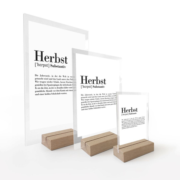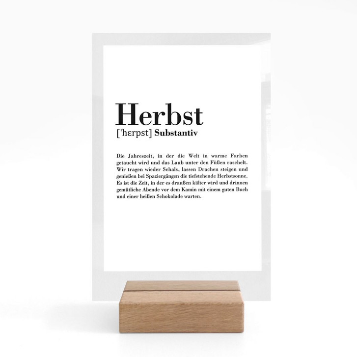 Der Acrylglas-Tischaufsteller „Herbst“ bringt die sanfte und gemütliche Atmosphäre dieser besonderen Jahreszeit direkt in dein Zuhause oder Büro. Mit einer klaren Definition des Wortes „Herbst“ und einer stimmungsvollen Beschreibung, die die schönsten Aspekte dieser Jahreszeit hervorhebt, ist dieser Aufsteller mehr als nur Dekoration – er erinnert an raschelnde Blätter, warme Farben und gemütliche Stunden.