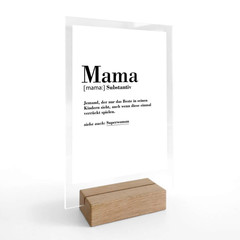 Edles Acrylglasbild zum Hinstellen aus klarem Acrylglas und massivem Holzfuss.