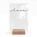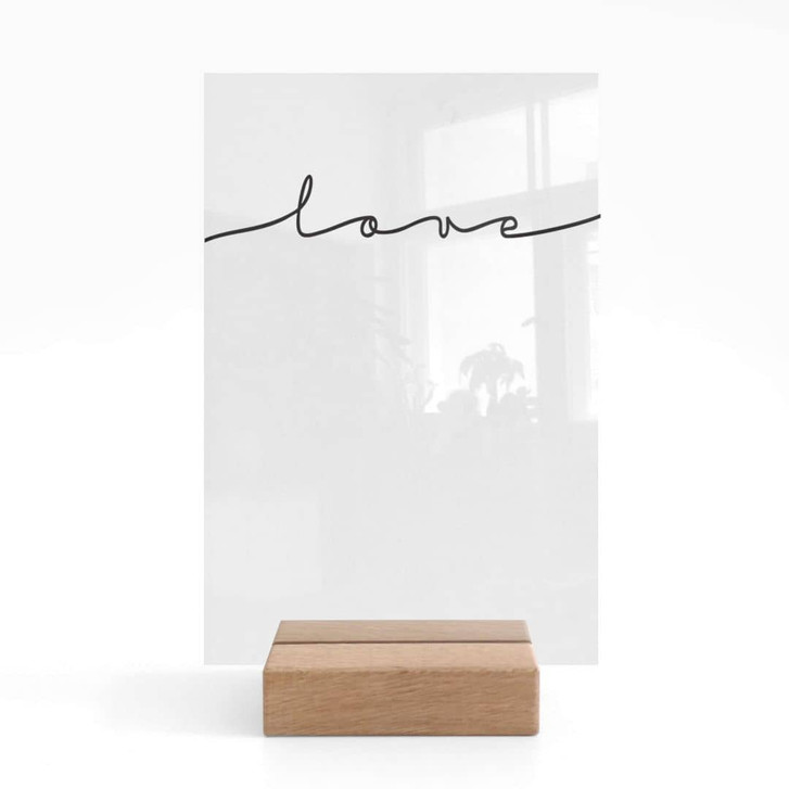 Edles Acrylglasbild zum Hinstellen aus klarem Acrylglas und massivem Holzfuss.