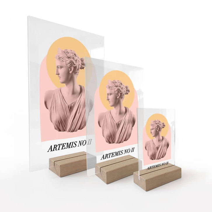 Edles Acrylglasbild zum Hinstellen aus klarem Acrylglas und massivem Holzfuss.