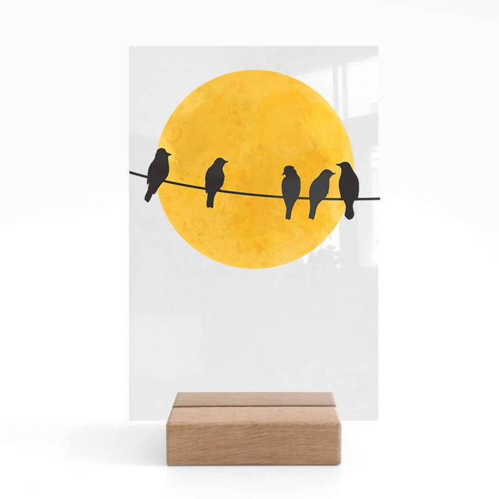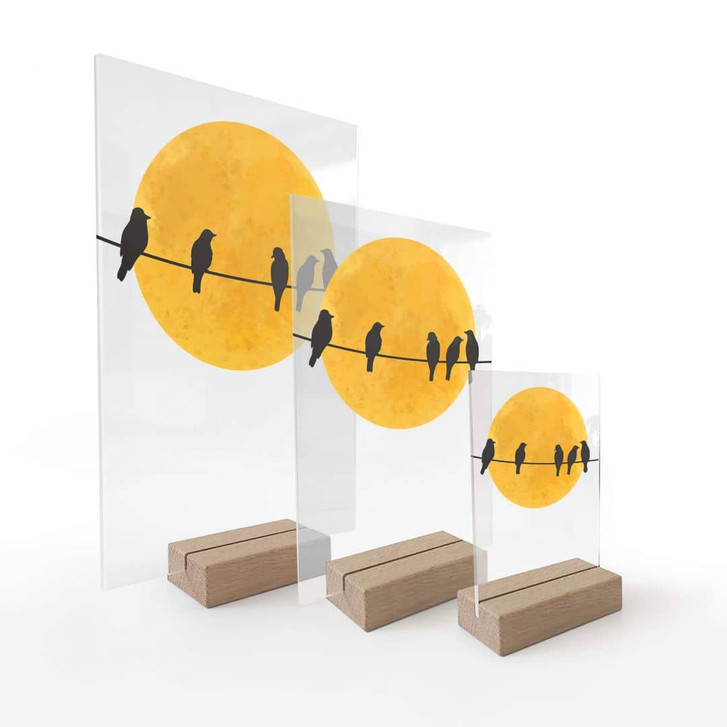 Edles Acrylglasbild zum Hinstellen aus klarem Acrylglas und massivem Holzfuss.