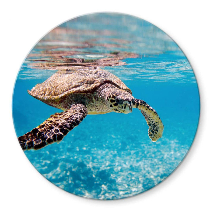 In der geheimnisvollen Unterwasserwelt leben nicht nur Fische. Hier sind auch Schildkröten zu finden, die mit ihren grossen Paddeln weite Strecken zurücklegen. Das Motiv „Travelling Turtle“ zeigt ein bemerkenswertes Meereswesen, das sich direkt unter den Sonnenstrahlen bewegt. Wohin die Reise der Schildkröte auch geht, in den unterschiedlichsten Räumen lassen sich damit schöne Akzente setzen.