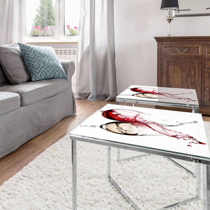 Diese quadratische Tischplatte aus 6 mm starkem Glas eignet sich ideal für Ess- und Couchtische und ist ein echter Hingucker! Unterstreiche deinen Wohnstil mit der hochwertigen Tischplatte und schaffe eine harmonische Umgebung, in der du dich wie zu Hause fühlen kannst. Setze mit den beiden Weingläsern ein optisches Highlight im Raum. Die Platte kann auch auf die vorhandene Tischoberfläche gelegt werden, um dem Tisch ein neues Aussehen zu verleihen. Die Oberfläche kann mit einem handelsüblichen Glasreiniger gereinigt werden.