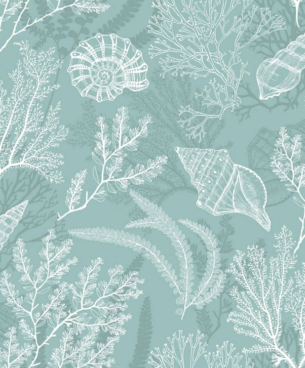 Vliestapete in Weiss, Grün, Muscheln, Unterwasser, Grafik, Natur
