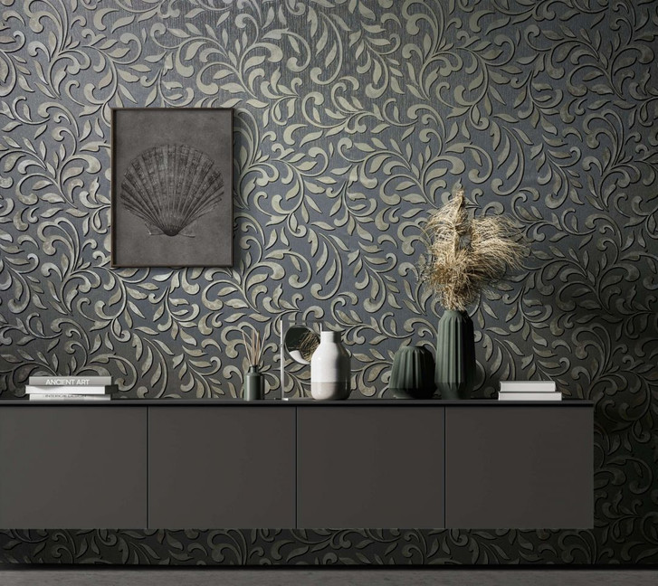 Vliestapete mit abstraktem Blattmotiv und Linienstruktur anthrazit, silber Grafik.