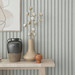 Vliestapete mit Akustikpaneele Optik und leichter Holzmaserung im Skandi Stil greige Streifen