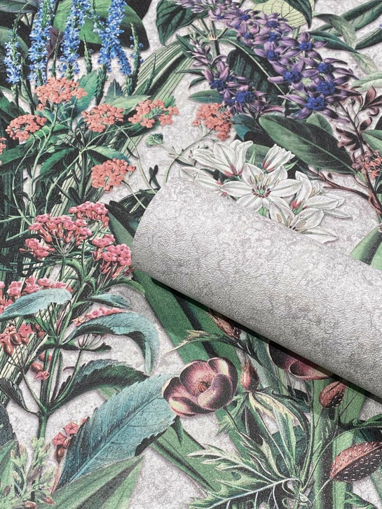 Vliestapete mit bunter Blumenwiese in Grau und Grün