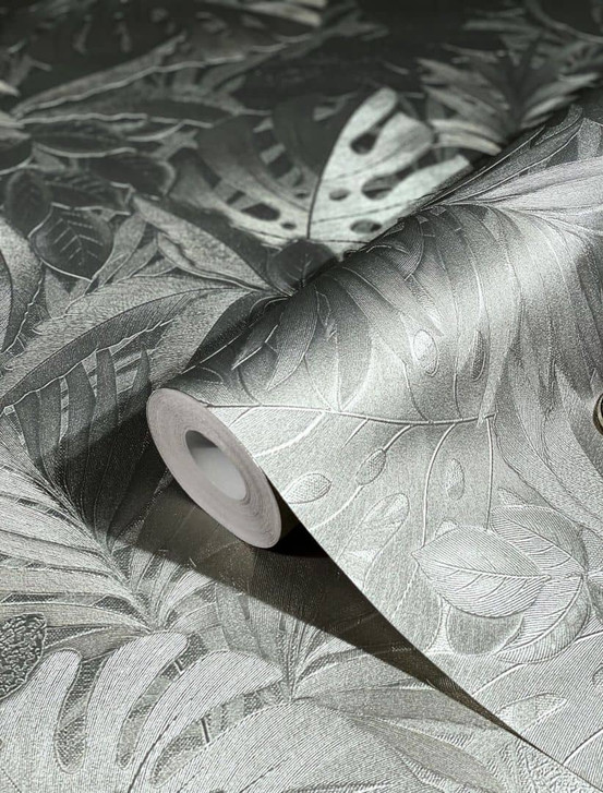 Vliestapete mit glänzenden Blättern metallisch platin Floral