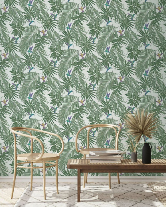 Vliestapete mit Kolibri und Blättern weiss, grün Floral