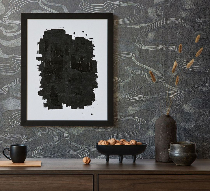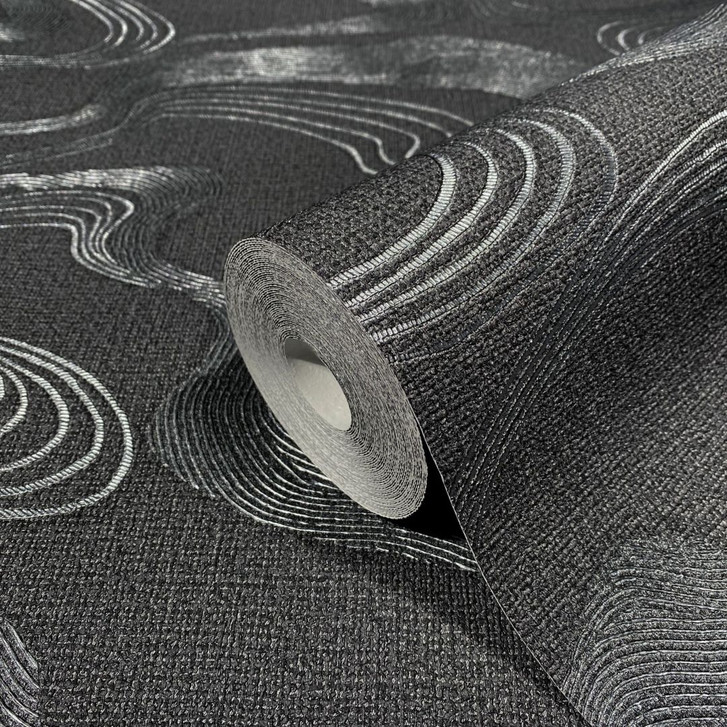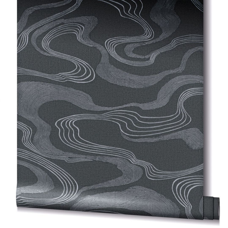 Vliestapete mit Nebeldunst in glänzenden Bögen, schwarz, grafisch