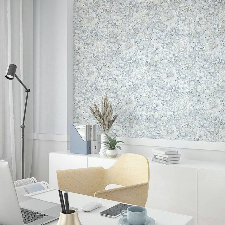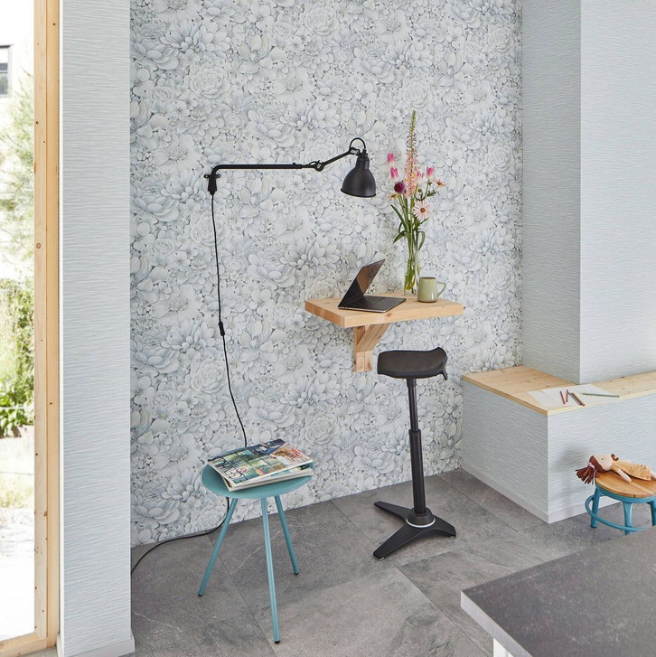 Vliestapete mit stark texturiertem blauen Blumenmotiv