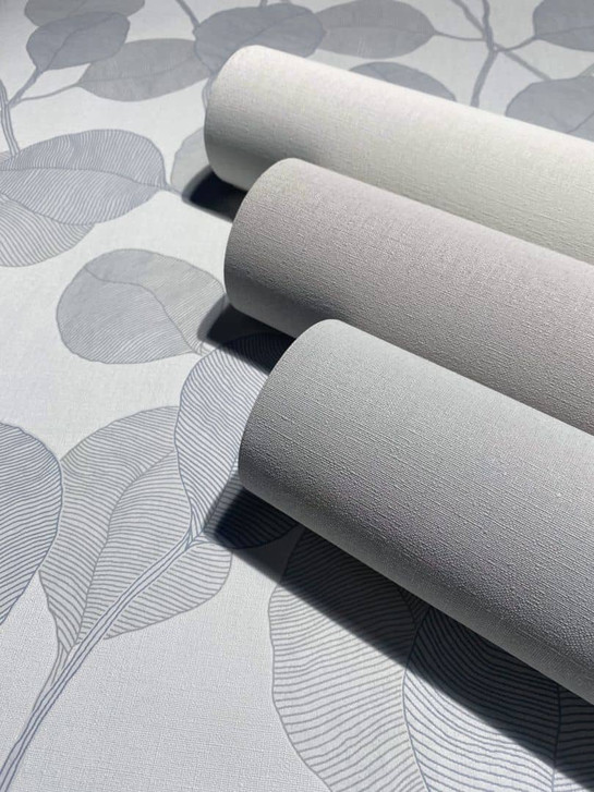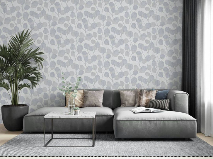 Vliestapete in schönem Weiß und Grau und Blau für Wohnzimmer, Schlafzimmer oder Küche. Die Tapete sorgt mit Ihrem Floral Look für ein modernes und angenehmes Raumgefühl.