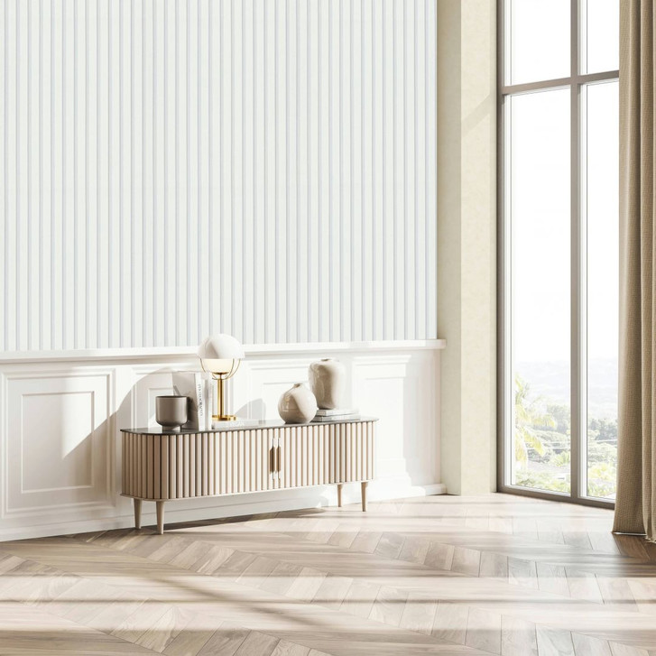 Vliestapete in schönem Weiß für Wohnzimmer, Schlafzimmer oder Büro. Die Tapete sorgt mit Ihrem Streifen Look für ein modernes und angenehmes Raumgefühl.