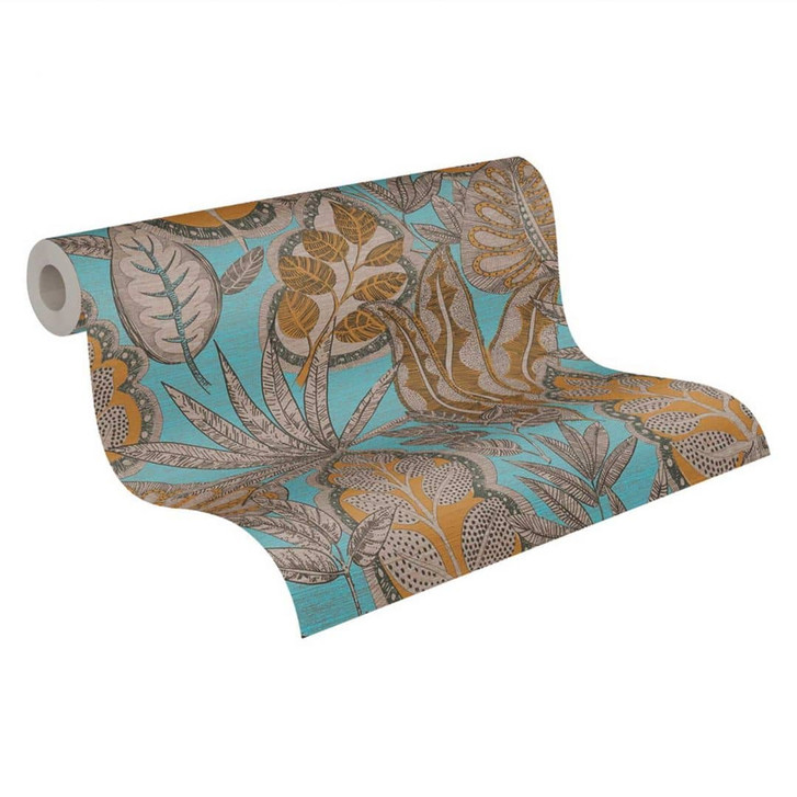Vliestapte im floralem Design Blau Gelb - Grafik-Tapete mit Blättern