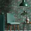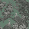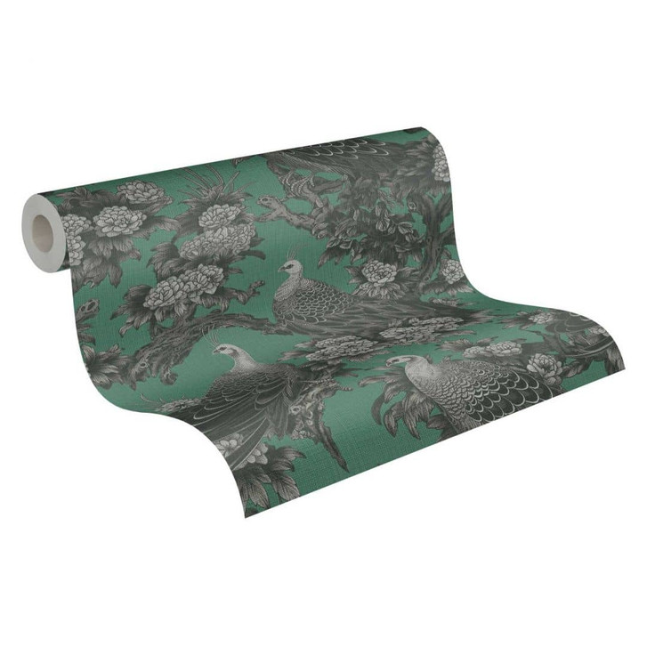 Michalsky 6 - Hochwertige Vliestapete mit kunstvollen Pfauen und Blüten in Schwarz auf grünem Hintergrund.