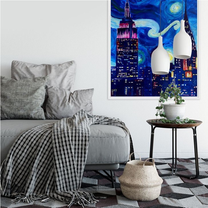 Der Wanddruck mit dem Kunstdruck „New York by Night“ des Malers Markus Bleichner zeigt die Ansicht des Empire State Building und des Chrysler Building. Das Wandbild ist in verschiedenen Grössen erhältlich.