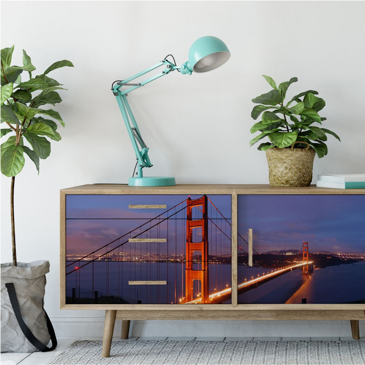 Der selbstklebende Wandprint zeigt die Golden Gate Bridge in Kalifornien bei Sonnenuntergang. Im Hintergrund links sind die Lichter von San Francisco zu sehen. Der selbstklebende Wandprint im Panoramaformat ist in verschiedenen Grössen erhältlich.
