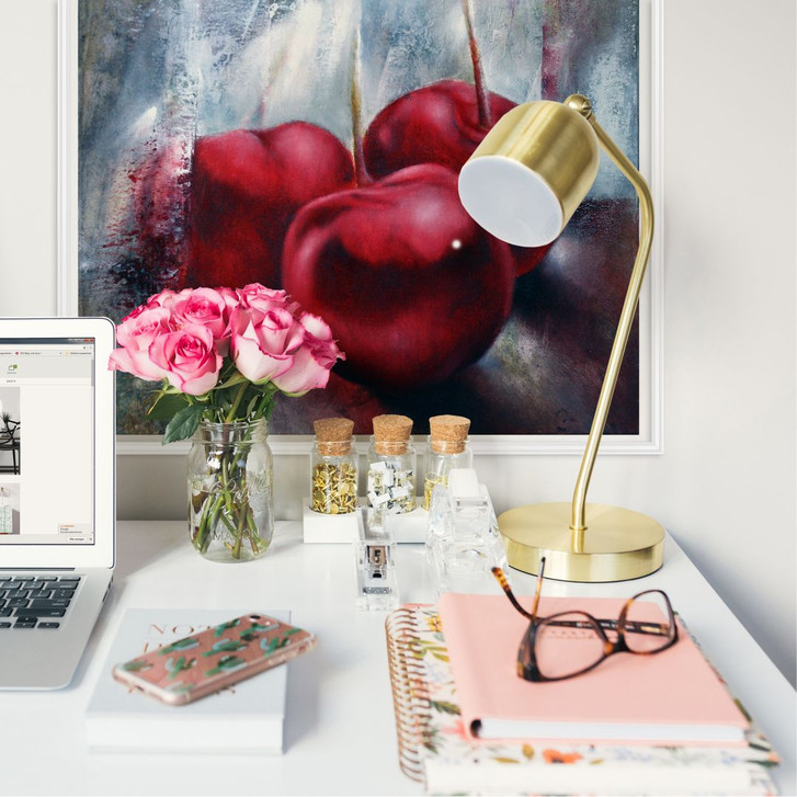 Das Motiv der zeitgenössischen Künstlerin Annette Schmucker zeigt drei Kirschen in leuchtenden Farbkontrasten.