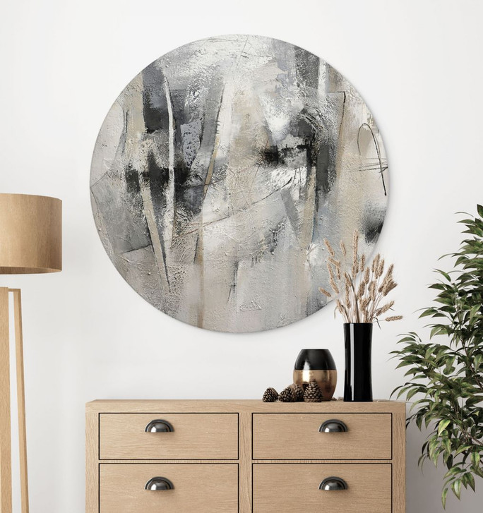 Die runde Wandkunst aus Aluminium-Dibond von Natalie Fedrau besticht durch ihre harmonische Ausgewogenheit von Struktur, Farbe und Form. Die abstrakten Grau- und Schwarztöne in Kombination mit subtilen Highlights schaffen ein Meisterwerk, das deine Wände mit modernem Stil bereichert. Die Textur des Bildes, die an künstlerische Pinselstriche erinnert, verleiht ihm eine faszinierende Tiefe.