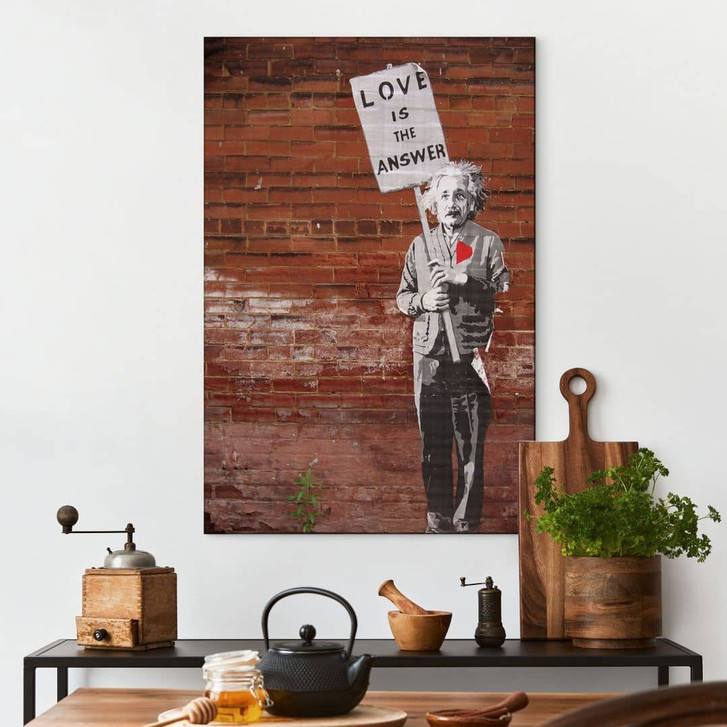 Die Kombination aus Banksys charakteristischer Schablonentechnik und der rauen Backsteinmauer als Hintergrund erzeugt eine starke visuelle Wirkung. Die hohe Druckqualität und das robuste Aluminium-Dibond-Material sorgen dafür, dass dieses Kunstwerk ein langlebiges Highlight in Ihrem Wohnraum bleibt. Ob im Wohnzimmer, im Büro oder im Eingangsbereich – dieses Bild verbreitet eine positive Botschaft und erinnert uns täglich daran, dass Liebe die wahre Antwort auf viele Fragen des Lebens ist. Hol dir mit diesem inspirierenden Werk ein Stück moderne Kunstgeschichte nach Hause und lass dich von Banksys einzigartiger Vision inspirieren.