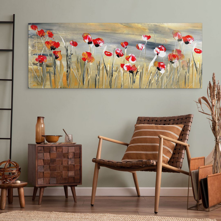 Erlebe die frische Lebendigkeit einer blühenden Blumenwiese in den eigenen vier Wänden. Dieses farbenfrohe Motiv zeigt eine Fülle von roten und orangefarbenen Blumen, die in einem stilisierten, modernen Stil dargestellt sind. Die leuchtenden Farben der Blumen heben sich lebhaft vom sanft strukturierten Hintergrund ab, der in dezenten Grau- und Beigetönen gehalten ist. Diese Kombination aus intensiven Farbakzenten und beruhigenden Hintergrundnuancen verleiht dem Bild eine besondere Dynamik und Harmonie.