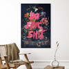 Die hohe Druckqualität und das langlebige Aluminium-Dibond-Material sorgen dafür, dass dieses Kunstwerk nicht nur ein optisches Highlight, sondern auch ein langlebiges Element Ihrer Inneneinrichtung ist. Die glatte, glänzende Oberfläche von Aluminium-Dibond verstärkt die Lebendigkeit der Farben und bringt sowohl die zarten Details der Blumen als auch die auffällige Schrift perfekt zur Geltung.