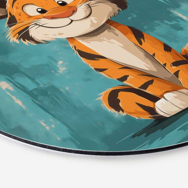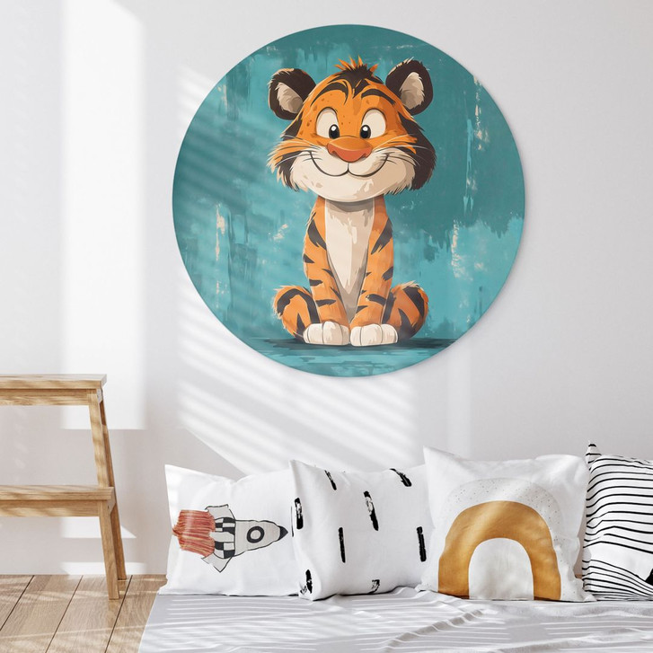 Die runde Form des Aluminium-Dibonds verleiht dem Motiv ein harmonisches und modernes Aussehen. Es setzt das freundliche Tigerbaby perfekt in Szene und macht das Bild zu einem echten Hingucker in jedem Raum. Die sanft strukturierte Farbfläche im Hintergrund verleiht dem Kunstwerk einen Hauch von Vintage-Charme und hebt den frechen, kindgerechten Stil des Tigers besonders hervor.