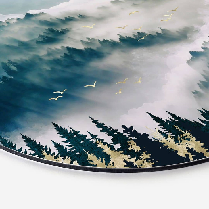 Dieses runde Bild aus Aluminium-Dibond bringt die faszinierende Ruhe eines nebelverhangenen Waldes in dein Zuhause. Das tiefe Blau und Grün der Bäume verschmilzt mit dem sanften Nebel, während goldene Lichtstrahlen und Vögel, die über den Himmel gleiten, eine stimmungsvolle Szene schaffen. Das Bild strahlt eine geheimnisvolle, beruhigende Kraft aus, die jeden Raum in einen Ort der Entspannung verwandelt.