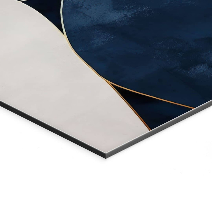 Dieses kunstvolle Bild spielt mit tiefem Blau, sanftem Weiss und feinen goldenen Linien, die sich zu einer harmonischen Komposition verbinden. Die ausgewogene Farbgebung und die weichen, fliessenden Formen schaffen eine moderne und beruhigende Atmosphäre, die den Blick einfängt und jedem Raum eine besondere Tiefe verleiht. Die goldenen Akzente setzen edle Highlights und unterstreichen die Eleganz des Motivs.