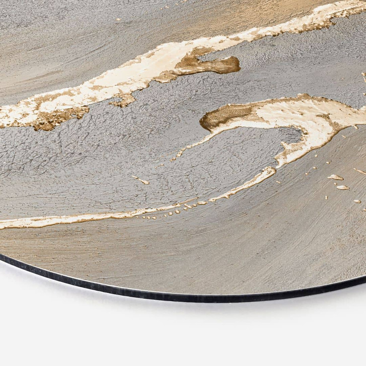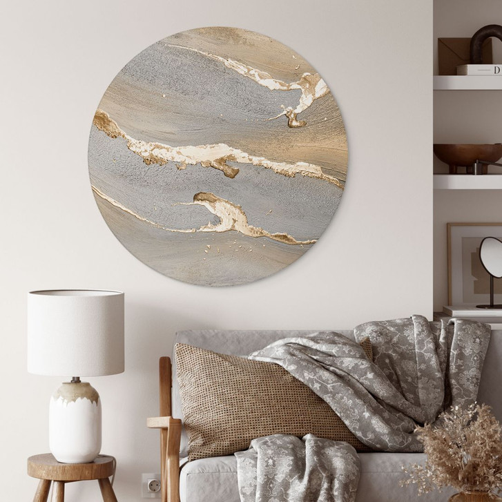 Dieses kreisrunde Kunstwerk auf Aluminium-Dibond besticht durch eine harmonische Kombination aus sanften Gold- und Grautönen, die in fliessenden, wellenartigen Strukturen ineinander übergehen. Das abstrakte Design erinnert an die zarten Muster von Sanddünen oder fliessendem Wasser und wirkt beruhigend und dynamisch zugleich. Die runde Form des Bildes verstärkt die fliessenden Bewegungen des Designs und verleiht dem Kunstwerk einen einzigartigen, modernen Charme.
