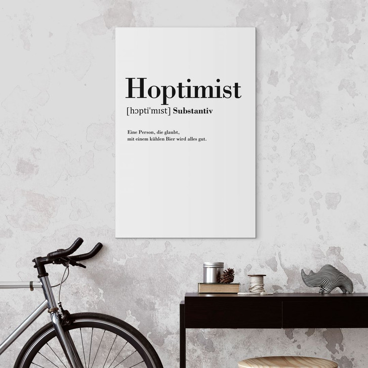Diese Wandkunst aus Alu-Dibond ist die perfekte Kombination aus Humor und modernem Design. Es definiert den „Hoptimisten“ – eine Person, die glaubt, dass alles gut wird, wenn man ein kühles Bier trinkt. Der schlichte und doch elegante Druck auf hochwertigem Aluminium-Dibond verleiht Ihrem Raum einen stilvollen Akzent und zaubert Ihren Gästen ein Lächeln auf die Lippen.