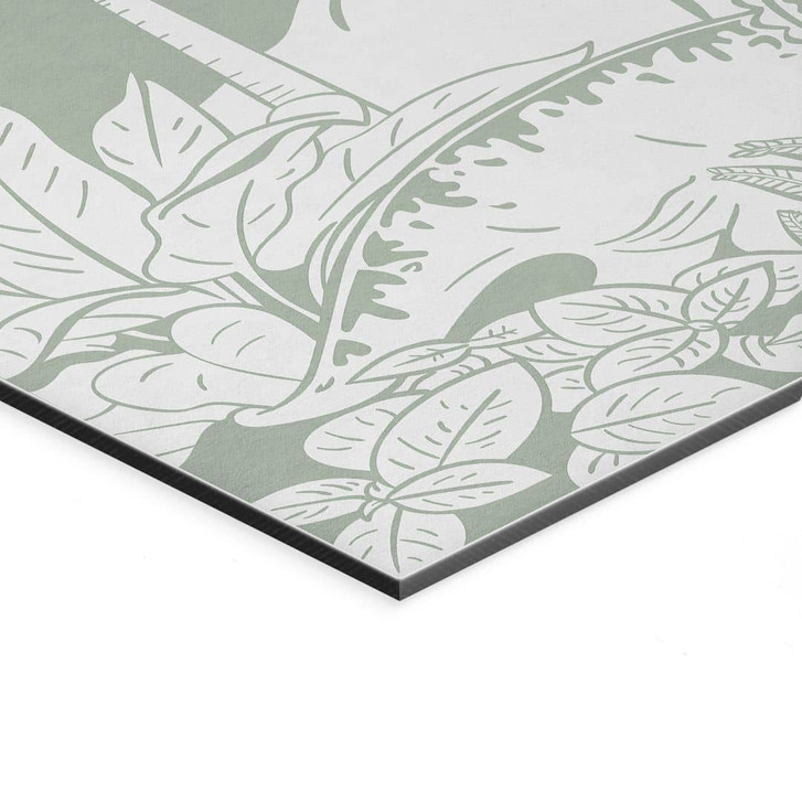 Dieses aussergewöhnliche Aluminium-Dibond-Motiv von Kikki Belle bringt die faszinierende Ära der Dinosaurier direkt in dein Zuhause. Die majestätischen Silhouetten des langhalsigen Brachiosaurus, des furchterregenden Tyrannosaurus Rex und des auffälligen Triceratops erwecken die prähistorische Welt zum Leben. Umgeben von üppigen Palmen und tropischen Pflanzen wird die Szene durch den sanften grünen Hintergrund abgerundet, der eine ruhige und dennoch lebendige Atmosphäre schafft.