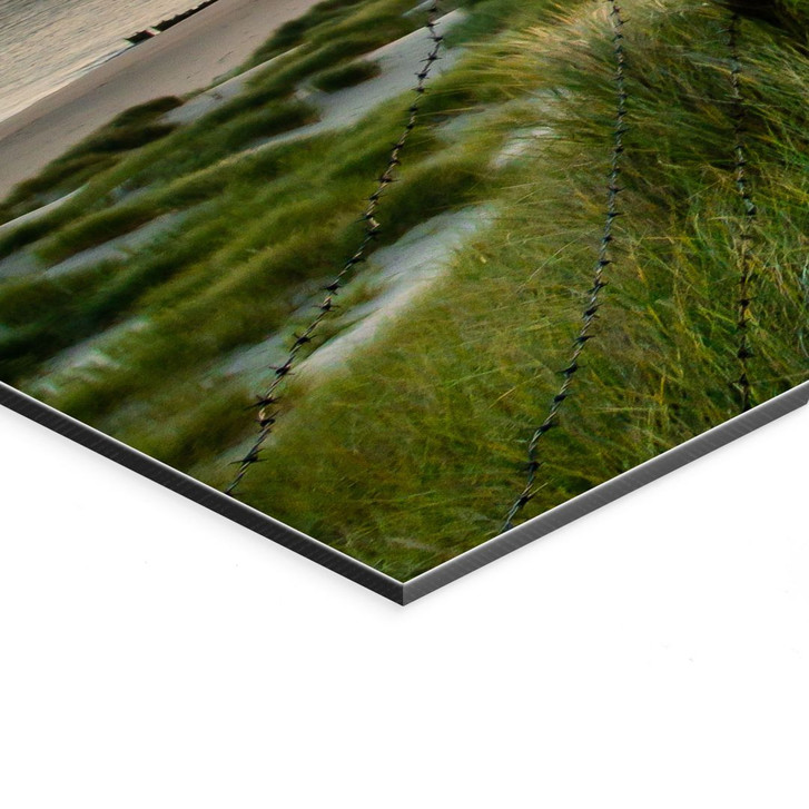 Dieser eindrucksvolle Panorama-Aluminiumdruck fängt die heitere Schönheit der Nordseeinsel Sylt ein. Der ikonische rot-weisse Leuchtturm steht majestätisch über den sanften Dünen. Der Himmel in warmen Sonnenuntergangsfarben, das weiche Gras und der Blick auf das weite Meer schaffen eine Szene voller Harmonie und Gelassenheit. Dieses Bild bringt die beruhigende Weite der Küste direkt in dein Zuhause.
