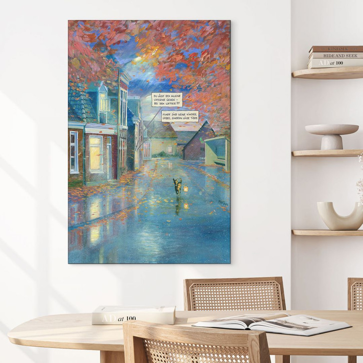 Die Abendszene zeigt einen Hund mit Laterne. Das kleine Haustier geht bei jedem Wetter allein spazieren. Hol dir den hochwertigen Kunstdruck als Alu-Dibond-Bild und schmücke deine Wand mit einem Motiv des Cartoonisten Wolf-Rüdiger Marunde!