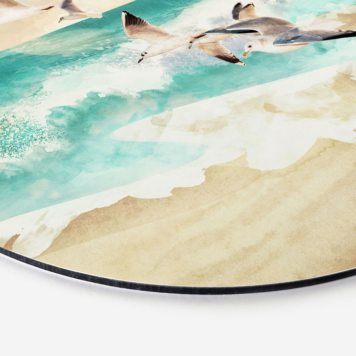 Schaffe dir mit diesem runden Bild deine ganz eigene Wohlfühloase und hol dir mit dieser Illustration den Charme der Küste nach Hause! Das Motiv stammt von SpaceFrog Designs und passt zu den Themen Strand & Wasser und Insekten & Tiere. Vergiss den Alltag und spüre das Küstenflair. Ein kleiner Möwenschwarm fliegt zielstrebig auf den Strand zu, im Hintergrund sieht man das türkisblaue Wasser mit starken Wellen. Lass mit dem maritimen Wandmotiv für einen Moment die Seele baumeln.