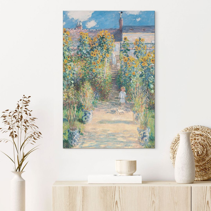 Geniesse die beeindruckende Leichtigkeit und Farbenvielfalt eines impressionistischen Meisterwerks mit diesem hochwertigen Alu-Dibond-Bild. Claude Monets malerische Darstellung eines üppigen Sommergartens entführt dich in eine Welt voller Sonnenblumen, blühender Sträucher und verspielter Details. Die Komposition vermittelt ein Gefühl von Wärme, Ruhe und unbeschwerter Eleganz, während das Sonnenlicht sanft durch das Laub schimmert und die Stufen eines verträumten Gartenwegs in goldenes Licht taucht.
