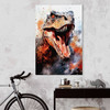 Die Farbpalette spielt mit Kontrasten: Die warmen Rottöne und das leuchtende Orange der Haut des Dinosauriers verschmelzen kunstvoll mit den kühlen Weiss- und Blautönen im Hintergrund. Dynamische Spritzer und rauchige Akzente verleihen dem Bild eine moderne Note und verstärken die wilde Energie, die von diesem Kunstwerk ausgeht.
