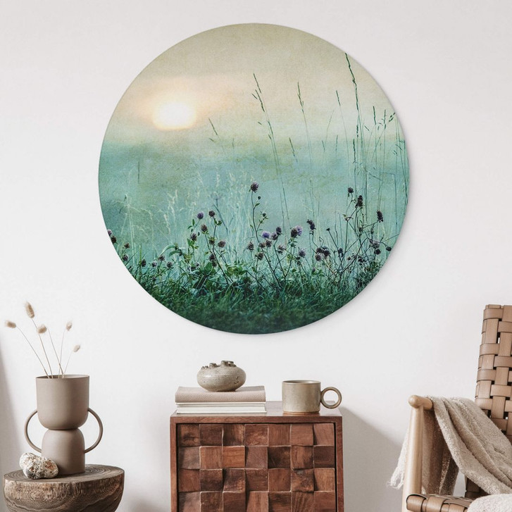Schmücke deine Wände mit frischen Farben und schaffe ein entspanntes Wohnambiente! Wache morgens neben einer idyllischen Landschaft auf und starte motiviert in den Tag. Die Fine Art-Fotografie von Asmund Kværnstrøm zeigt einen Sonnenaufgang in einer herbstlichen Landschaft. Die feinen Gräser betonen die Schönheit der Natur im Morgennebel. Dieses Fotomotiv wird dich jeden Tag aufs Neue begeistern und ist eine schnelle und einfache Möglichkeit, deine Wand aufzuhübschen. Gestalte deine Wände mit dem runden Alu-Dibond-Bild und schaffe eine lebendige Wohnatmosphäre! Das Bild in türkisen Farben kommt in einem runden Design für dein Zuhause. Das Material zeichnet sich durch hohe Stabilität und Hitzebeständigkeit aus und sorgt mit seiner speziellen Veredelung für eine edle Optik. Mit diesem Bild kannst du ganz einfach eine harmonische Wand in deinem Zuhause gestalten.