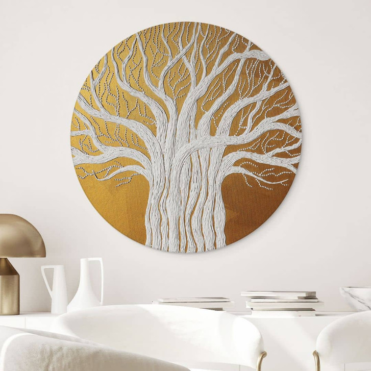 Dieses runde Alu-Dibond-Kunstwerk verbindet die tiefe Symbolik des Lebensbaums mit einer modernen, stilvollen Präsentation. Der weisse Baum mit seinen weit ausladenden Ästen steht für Wachstum, Stärke und Verbundenheit – ein Symbol für das Leben selbst. Der goldene Hintergrund erzeugt eine warme, luxuriöse Ausstrahlung, die die majestätische Wirkung des Motivs verstärkt und eine beruhigende, harmonische Atmosphäre schafft.