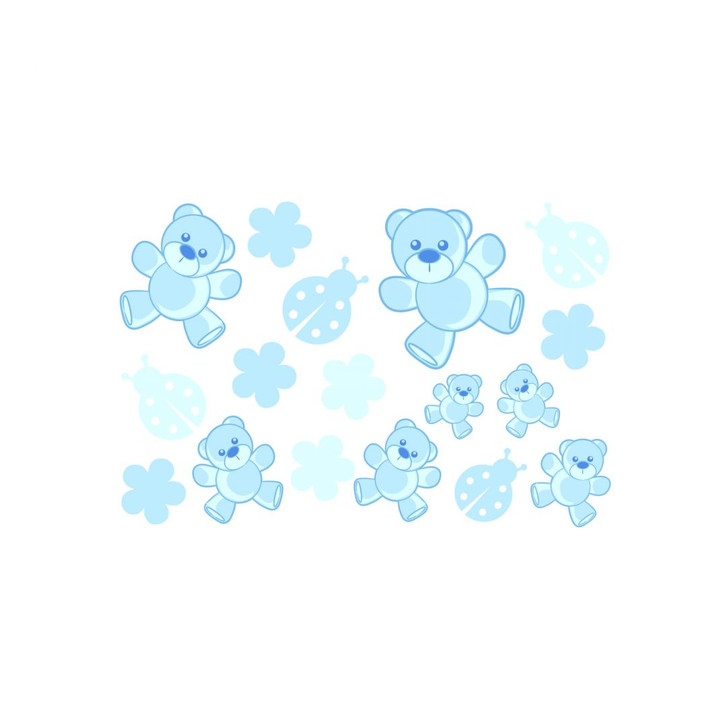 Die Wanddekoration im Kinderzimmer wird mit besonderer Liebe und Sorgfalt ausgewählt. Das Wandtattoo „Bärenjunges“ ist besonders niedlich für kleine Jungen. Die 17 Teile dieses Wandstickers können nach Belieben an Wänden, Türen und Möbeln angebracht werden. Sieben kuschelige Teddybären, vier Marienkäfer und sechs Blumen in zartem Hellblau bieten zahlreiche Gestaltungsmöglichkeiten.
