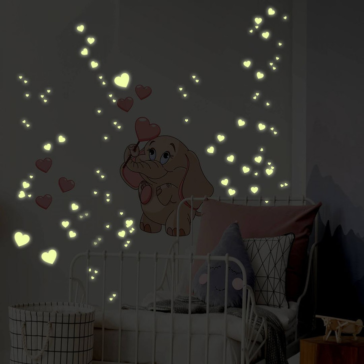Das süsse Wandtattoo mit dem kleinen rosa Elefantenbaby kann jetzt mit tollen Leuchtaufklebern kombiniert werden! Wenn sie tagsüber von Licht getroffen werden, laden sich die fluoreszierenden Herzen auf und leuchten im Dunkeln. Mit diesem Wandtattoo hast du eine tolle Dekoration für Tag und Nacht.
