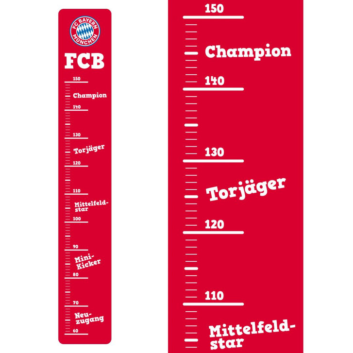 Die Messlatte misst eine Körpergrösse von 60 bis 150 cm, sodass der Wandaufkleber zu einem unvergesslichen Teil der Kindheit deiner Liebsten wird. Verfolge ihr Wachstum bis zur Champion-Stufe und feiere nicht nur den Verein, sondern auch den Erfolg der heranwachsenden Fans! Viele weitere Wandaufkleber und Fanartikel vom FC Bayern München sind auf trenddeko.ch erhältlich.