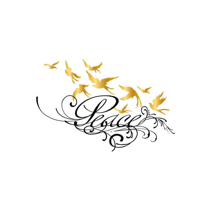 Das Design, direkt aus dem berühmten Tattoo-Studio LA Ink in Los Angeles, zeigt einen schwarzen, verspielten Schriftzug Peace. Darüber fliegen neun goldene Tauben als symbolische Friedenstauben davon. Das Wandtattoo ist in fünf verschiedenen Grössen erhältlich.