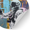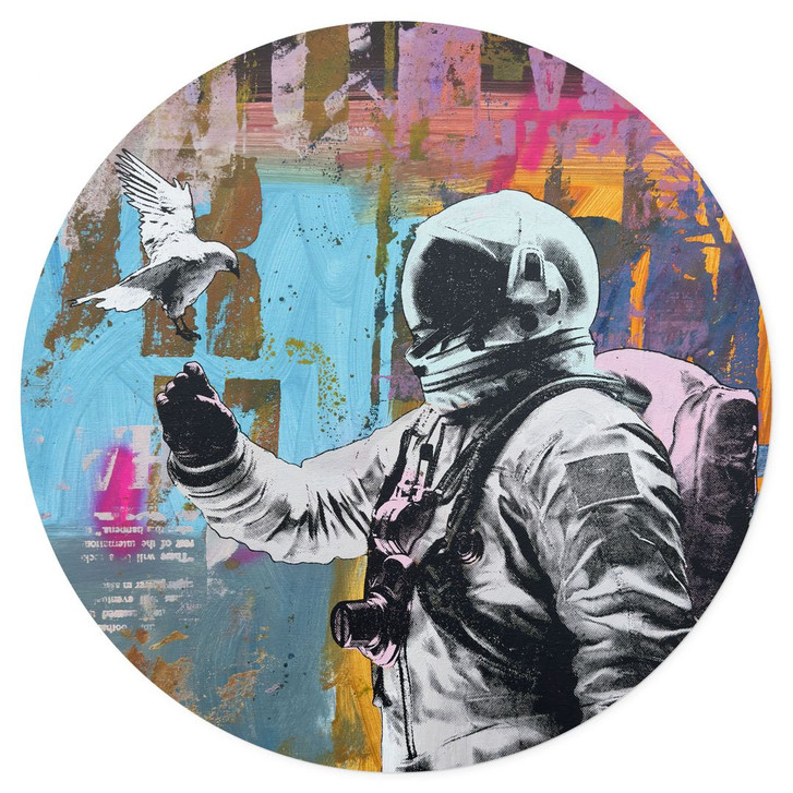 Dieser runde Wandsticker von Kuryliuk bringt mit seiner ausdrucksstarken Bildsprache ein einzigartiges Kunstwerk in deine Wohnräume. Ein Astronaut in präzisem Schwarz-Weiss, der sanft eine schwebende Taube berührt, symbolisiert die perfekte Harmonie von Freiheit und Erkundung, von Frieden und Abenteuer. Die minimalistische Darstellung des Astronauten hebt sich deutlich vom lebendigen, farbenfrohen Hintergrund ab.