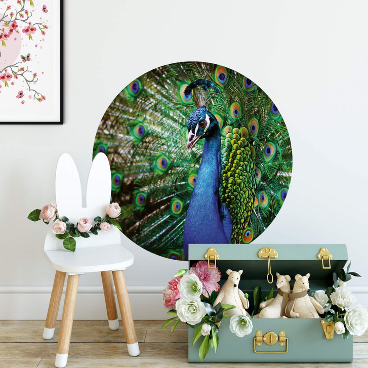 Der männliche Pfau in blauer Farbe beeindruckt durch seine schleppenartigen Schwanzfedern und sein unverwechselbares Gefieder in schimmernden Blau- und Grüntönen. Wenn der Vogel sein Rad geöffnet hat, sieht er besonders schön und beeindruckend aus. Als rundes Wandtattoo passt es sich dank seiner Struktur optimal an unterschiedliche Wandoberflächen an. So lassen sich damit auch Dachschrägen oder verwinkelte Wände aufpeppen. Das Beste daran: Diese Dekoration lässt sich dank selbstklebendem Material kinderleicht anbringen und sorgt mit ihrer grünen und blauen Farbgebung einfach für gute Laune.