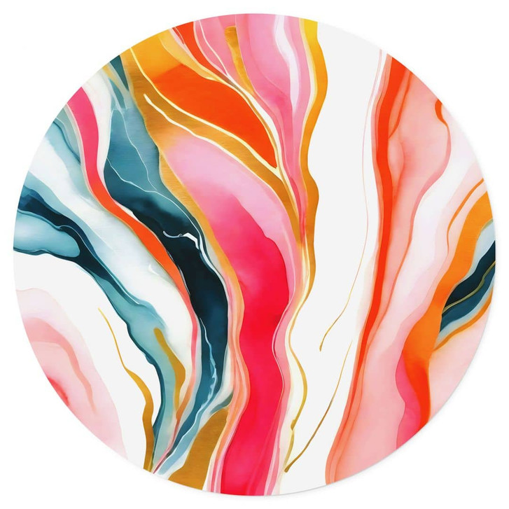 Dieser runde Wandsticker besticht durch seine kräftigen Farben und die dynamische, fliessende Marmorierung. Lebendige Farbtöne in Pink, Orange, Blau und Gold fügen sich harmonisch zu einer energiegeladenen, abstrakten Komposition zusammen. Die sanften Farbverläufe erzeugen eine besondere Tiefe und Dynamik, die jeden Raum in eine Galerie für moderne Kunst verwandeln.
